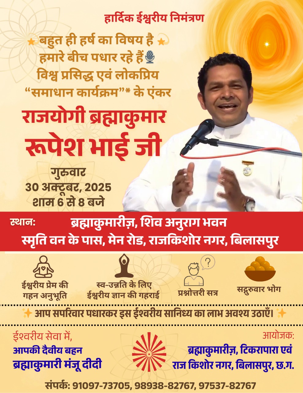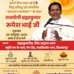 बिलासपुर। ब्रह्माकुमारीज़ राजकिशोर नगर सेवा केंद्र में गुरुवार, 30 अक्टूबर 2025 को “ स्व उन्नति एवं गहन योग अनुभूति” पर एक विशेष सत्र का आयोजन किया जा रहा है। इस अवसर पर ब्रह्माकुमारीज़ मुख्यालय, माउंट आबू से विश्व प्रसिद्ध एवं लोकप्रिय कार्यक्रम “समाधान” के एंकर — राजयोगी ब्रह्मा कुमार रूपेश भाई का आगमन हो रहा है।