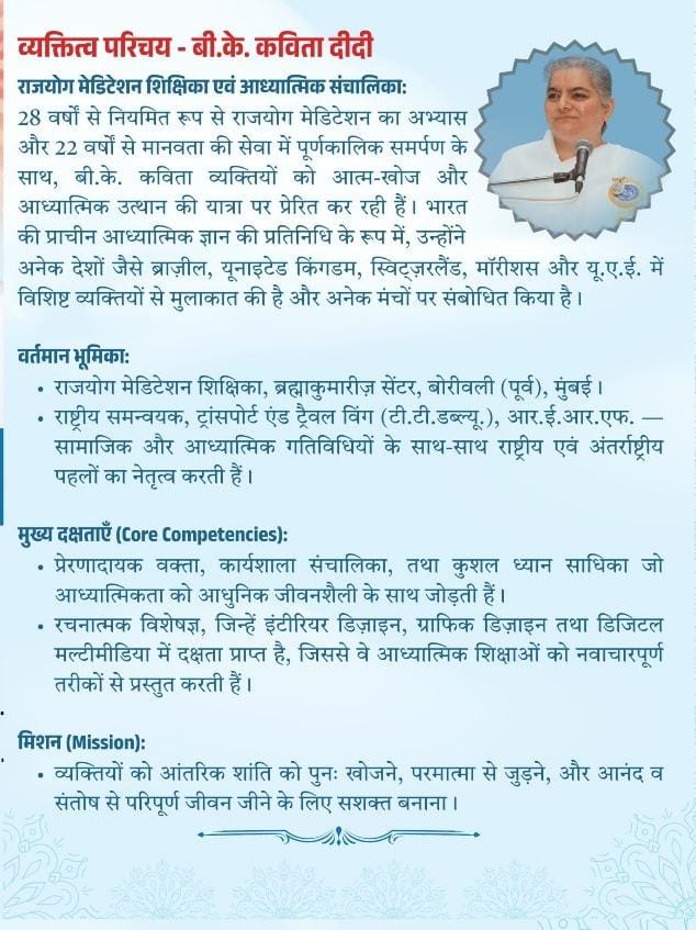 इस कार्यक्रम में मुख्य वक्ता के रूप में आदरणीय बी.के. कविता दीदी, (वरिष्ठ राजयोग शिक्षिका एवं नेशनल कोऑर्डिनेटर, ट्रांसपोर्ट विंग, मुंबई) उपस्थित रहेंगी। दीदी जी द्वारा आत्म-अनुभूति, ध्यान-साधना, भावनात्मक स्थिरता, आध्यात्मिक मूल्यों की भूमिका तथा जीवन में जागरूकता के महत्व पर विस्तार से मार्गदर्शन दिया जाएगा।